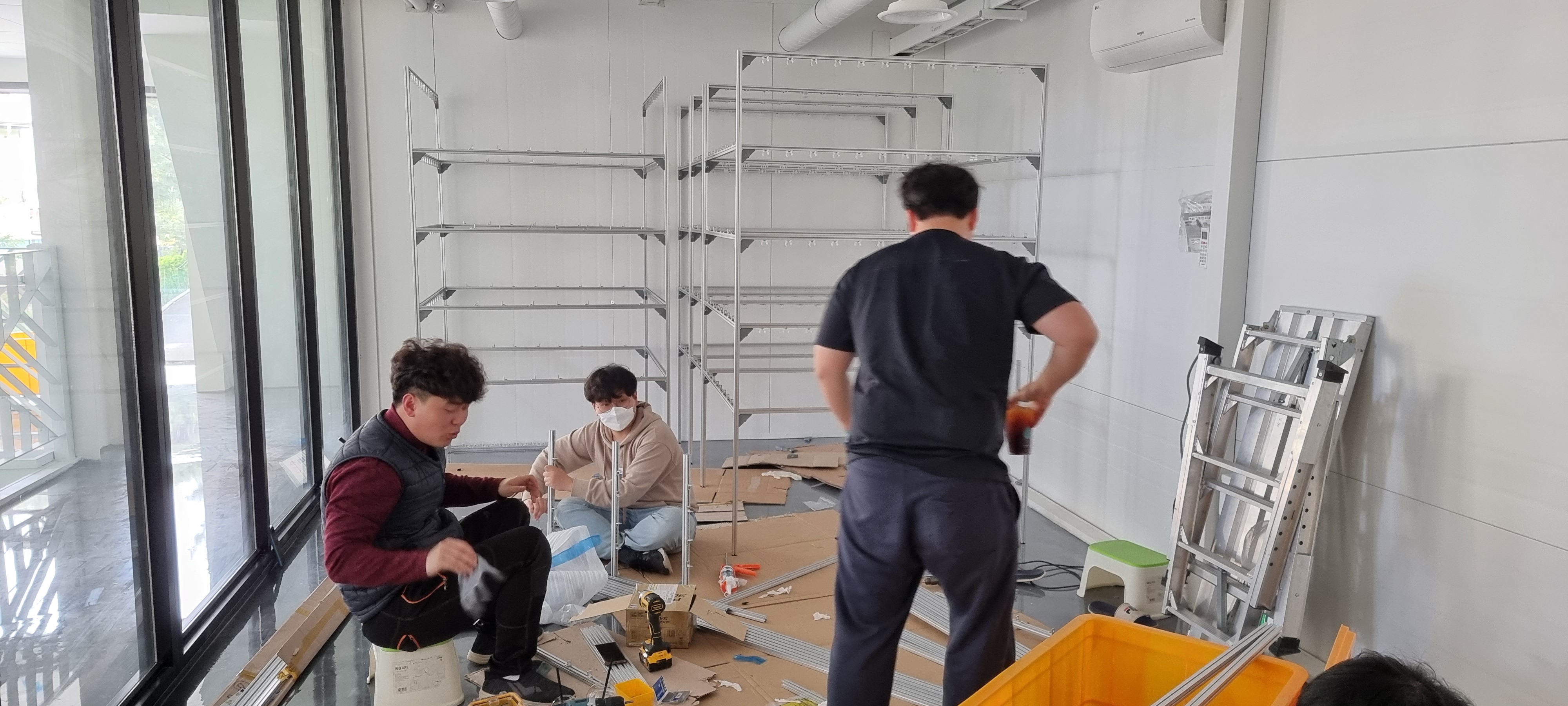프레임 설치 단계입니다. 이번 식물공장 공사는 1cm 1cm가 매우 아쉬운 상황이였습니다. 보통은 4040프로파일을 쓰는 것이 안정성 면에서 더 좋습니다만, 작업공간 확보를 위해 2020 알루미늄 프로파일로 설치하기로 했습니다. (6단 이상의 시설에는 절대 2020 프로파일을 사용해서는 안됩니다!)