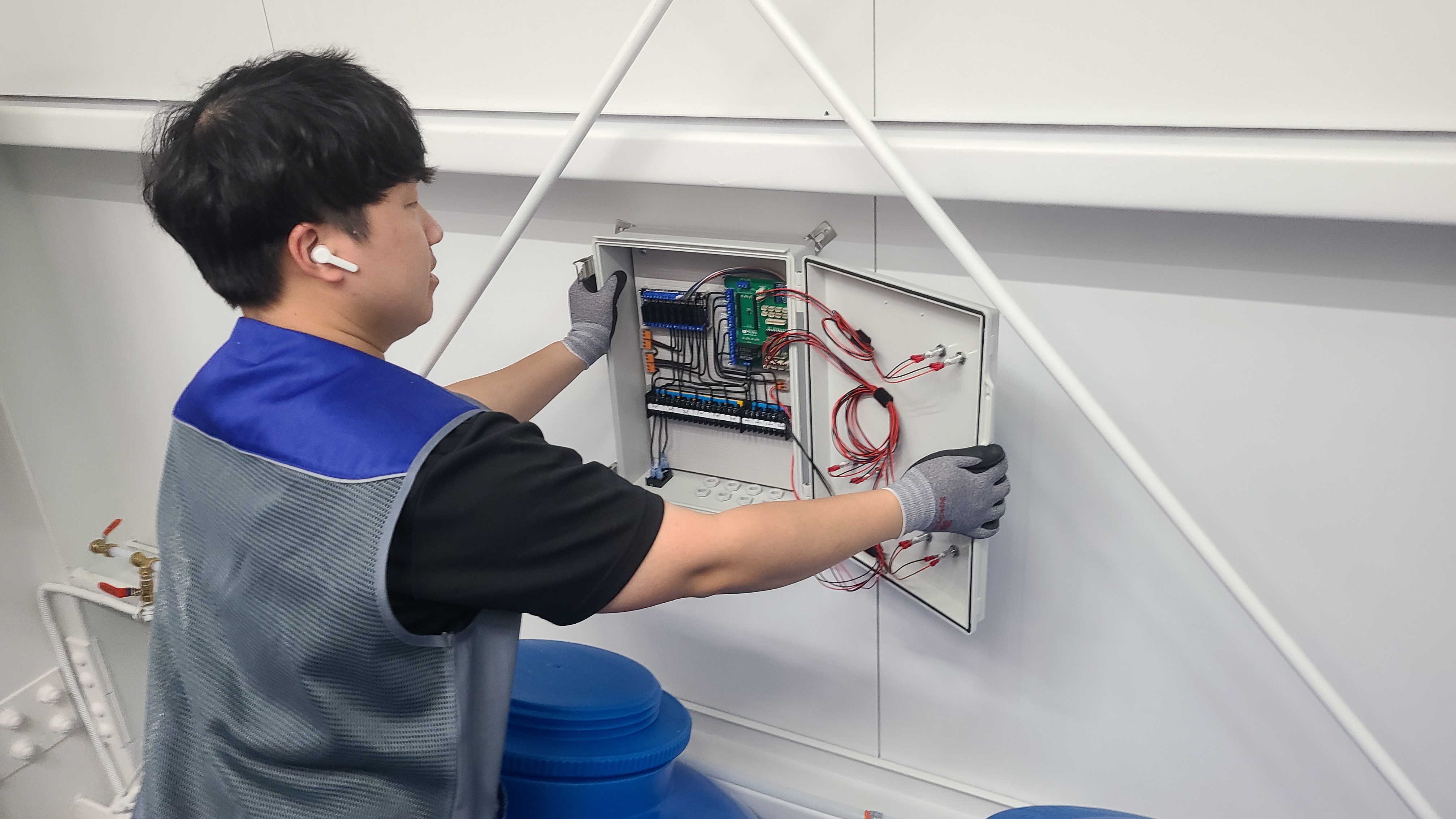 재배기/양액기의 제어 및 작동상태를 조정하고 확인할 수 있는 각종 제어함을 설치하는 단계입니다.