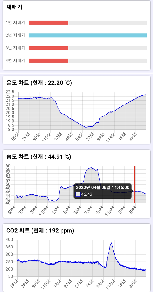 식물공장 제어페이지(스마트폰)입니다. 창고에 있는 에어콘은 리모콘으로 직접 제어하시겠다고 하셔서 빼고 설치했습니다. 또한 창고 내부가 카페랑 공기가 순환되는 형태로 되어있어서 카페 2층에서 CO2를 트는것이 비효율적이라는 판단으로 별도의 CO2공급 시스템은 놓지 않았습니다.